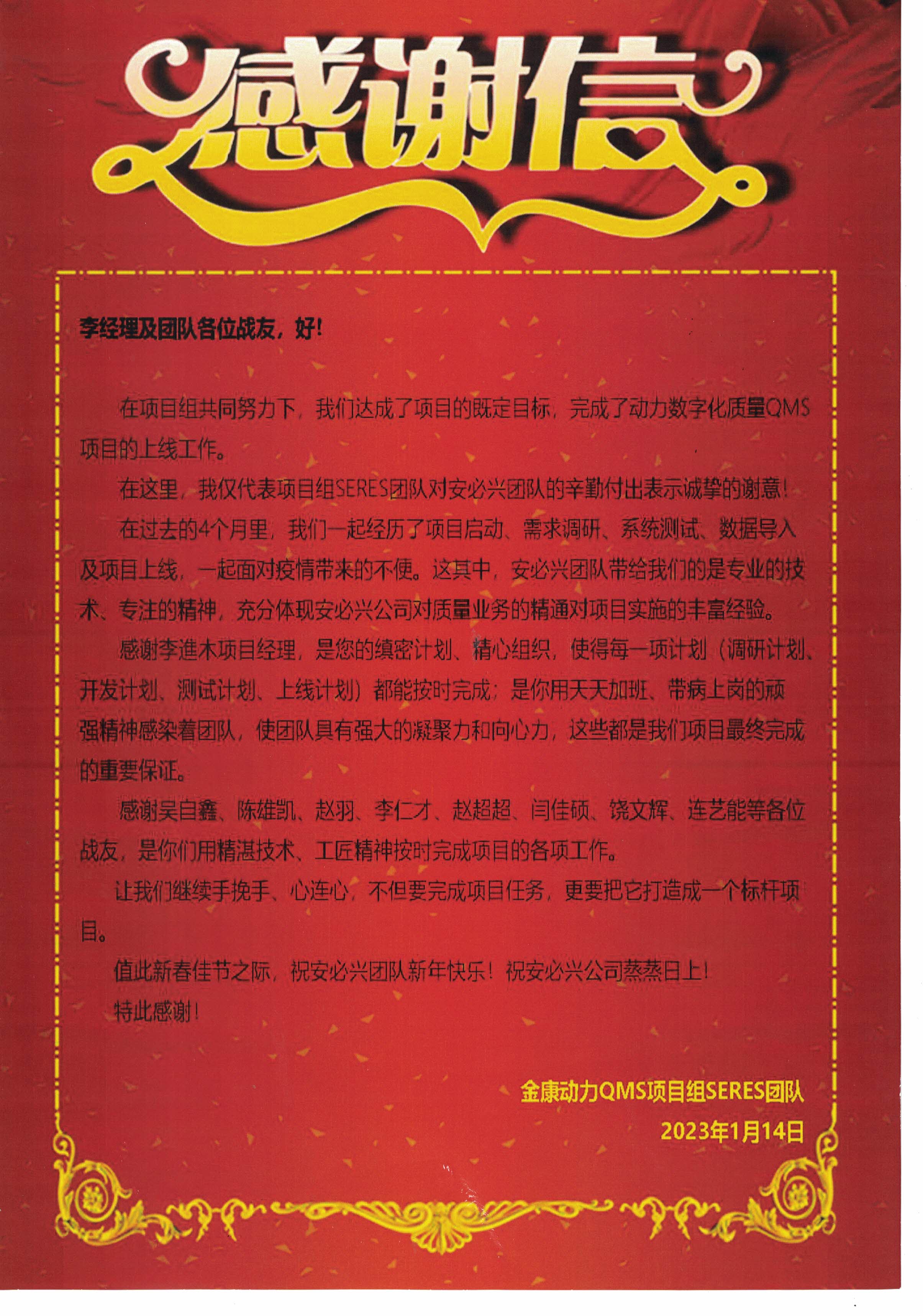 大会上,金康动力着重强调:自携手安必兴引进QMS质量管理系统以来,成功完成了质量管理纸质化到无纸化的业务转型,成功实现了质量管理在线监控、动态统计和质量预测分析;数据全自动数字化采集、自动判定、自动调用、自动匹配等质量数据管理先进技术,提高作业精准度、可靠度,减少作业时长,提高检验效率;对安必兴QMS质量管理系统的实用性、操控性、灵活性、稳定性等多方面给予了高度评价。还曾在一期项目上线时,专门为对安必兴项目实施小组递了感谢信。