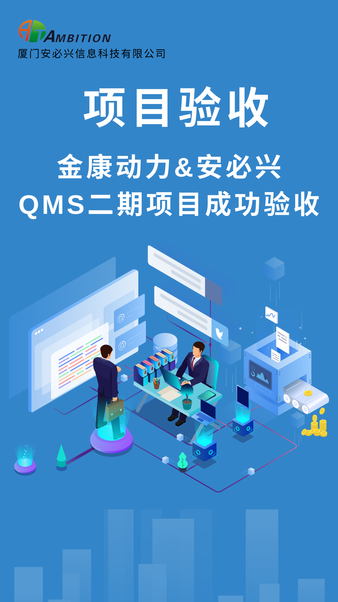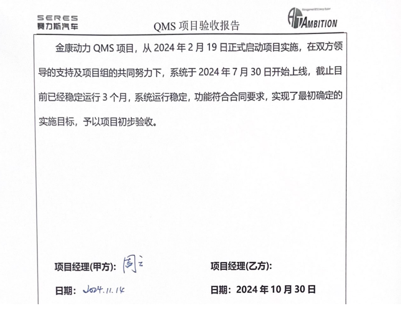 经过安必兴与金康动力双方项目组共同的努力配合下,安必兴&金康动力QMS质量管理系统二期项目历经5个月时间,在2024年7月30日正式上线。上线3个月以来,系统运行平稳,日常业务均运转正常,于2024年10月30日正式完成验收,打破了质量系统上线较快纪录。