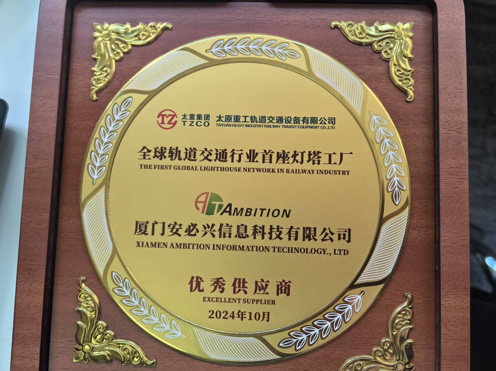厦门安必兴信息科技有限公司凭借为“灯塔工厂”——太原重工轨道交通设备有限公司打造的QMS质量管理信息系统数字化解决方案,荣获客户颁发的“2024年度优秀供应商”奖牌!这一殊荣不仅是对安必兴技术实力与服务能力的权威认可,更是双方携手推进轨道交通行业质量管理智能化转型的里程碑时刻。